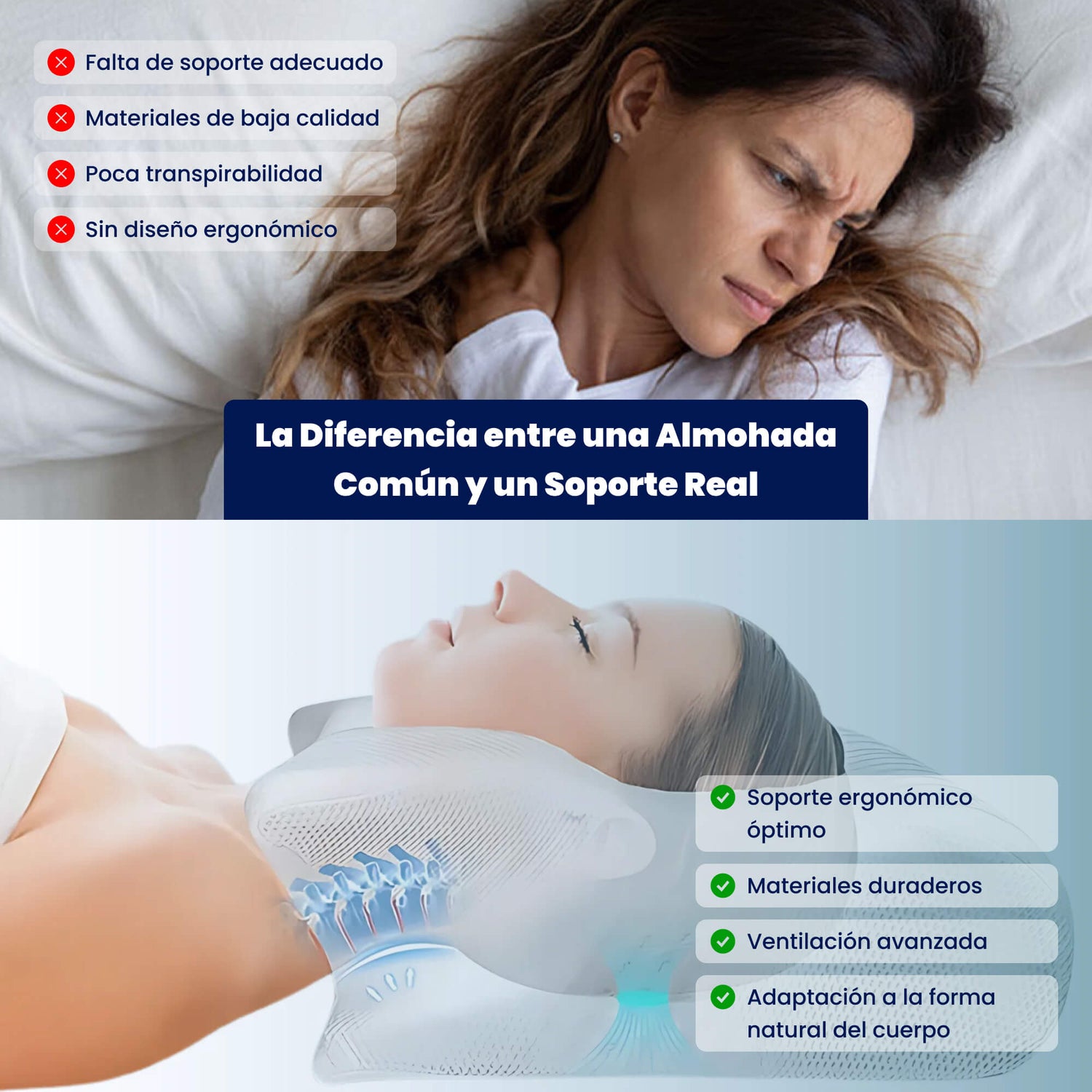 Almohada ProDescanso con soporte cervical ergonómico. Diseñada para alinear tu cuello, aliviar tensiones y mejorar la calidad del sueño.